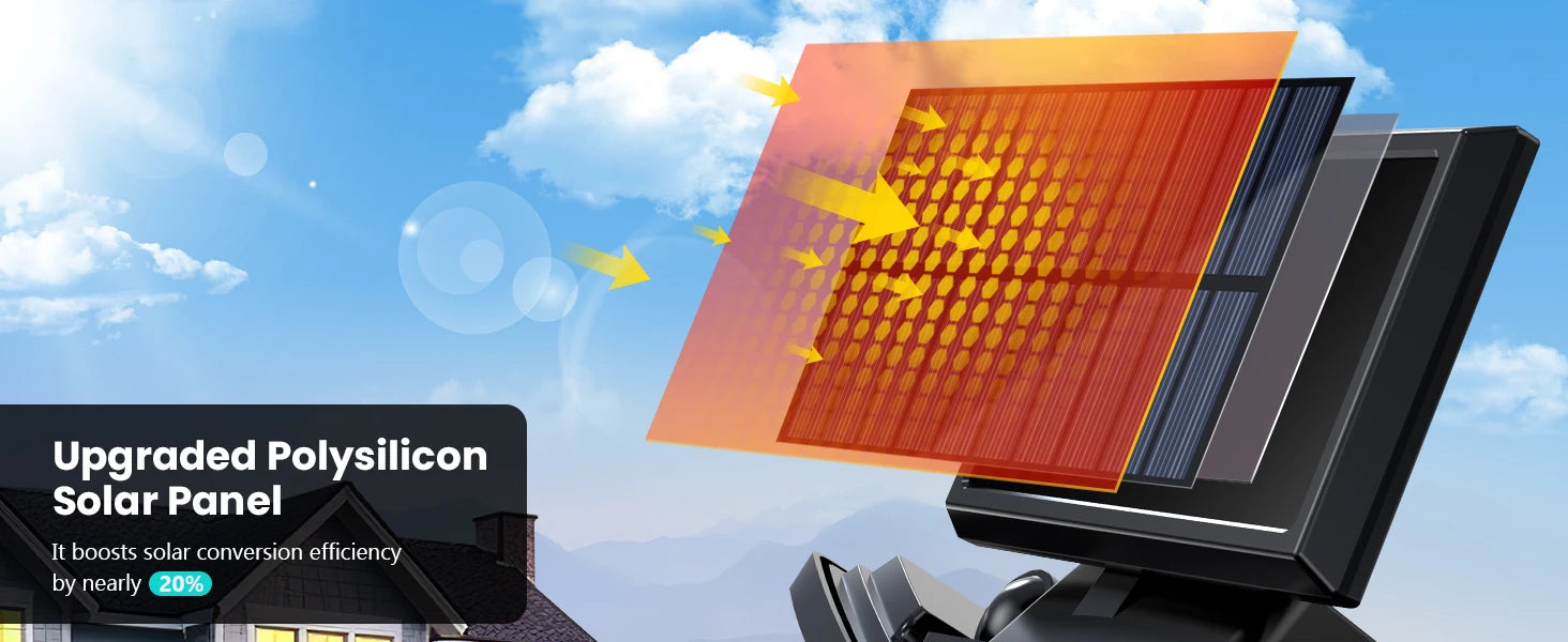 【Wide Angle Illumination & PIR Motion Inductor】:3 adjustable heads design can horizontally. With innovative wide-angle and intelligent induction control, solar flood light detects up to 270 ° wide lighting angle and 26 feet sensing distance,which can provide extra brightness and more visible area.