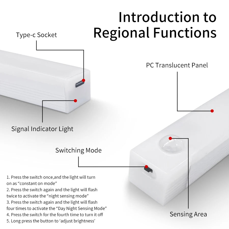 1: Human body induction sensor: This human body induction wardrobe light has high sensitivity and high precision, this LED wardrobe light can detect your motion within 5 meters, and automatically turn off within 25 seconds. No more pressing the switch button in the dark.